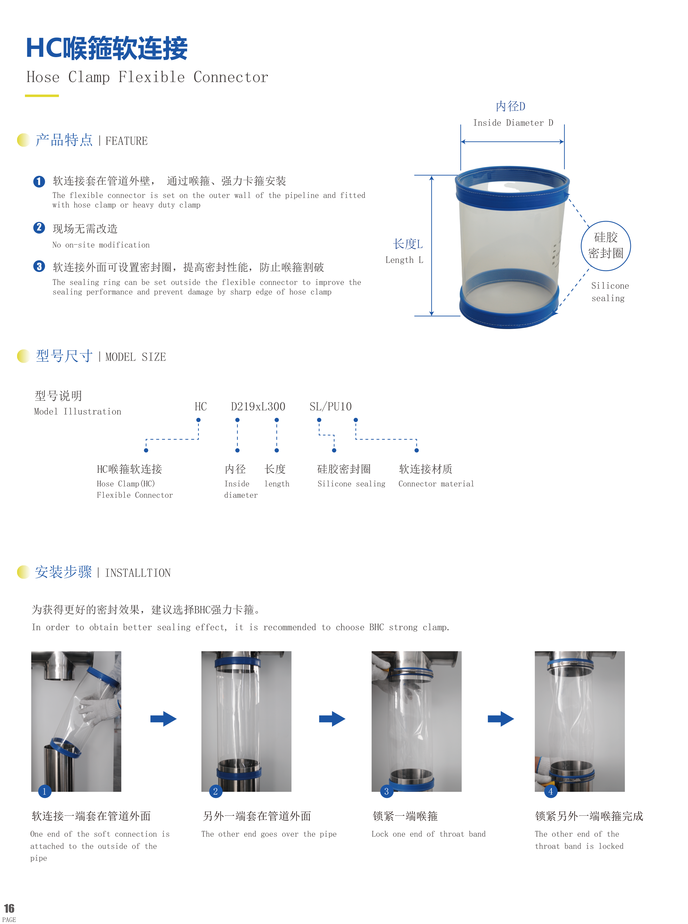 1、軟連接套在管道外壁, 通過喉箍、強力卡箍安裝